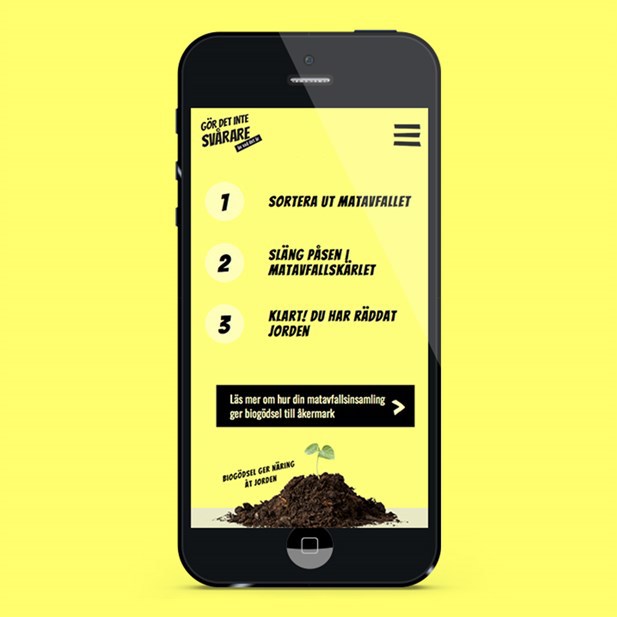 Kampanjen består av 3 filmer, 1 kampanjsida med artiklar och information kring matavfallsinsamling, tryckmaterial som klistermärke, matavfallspåse och tryckannonser.