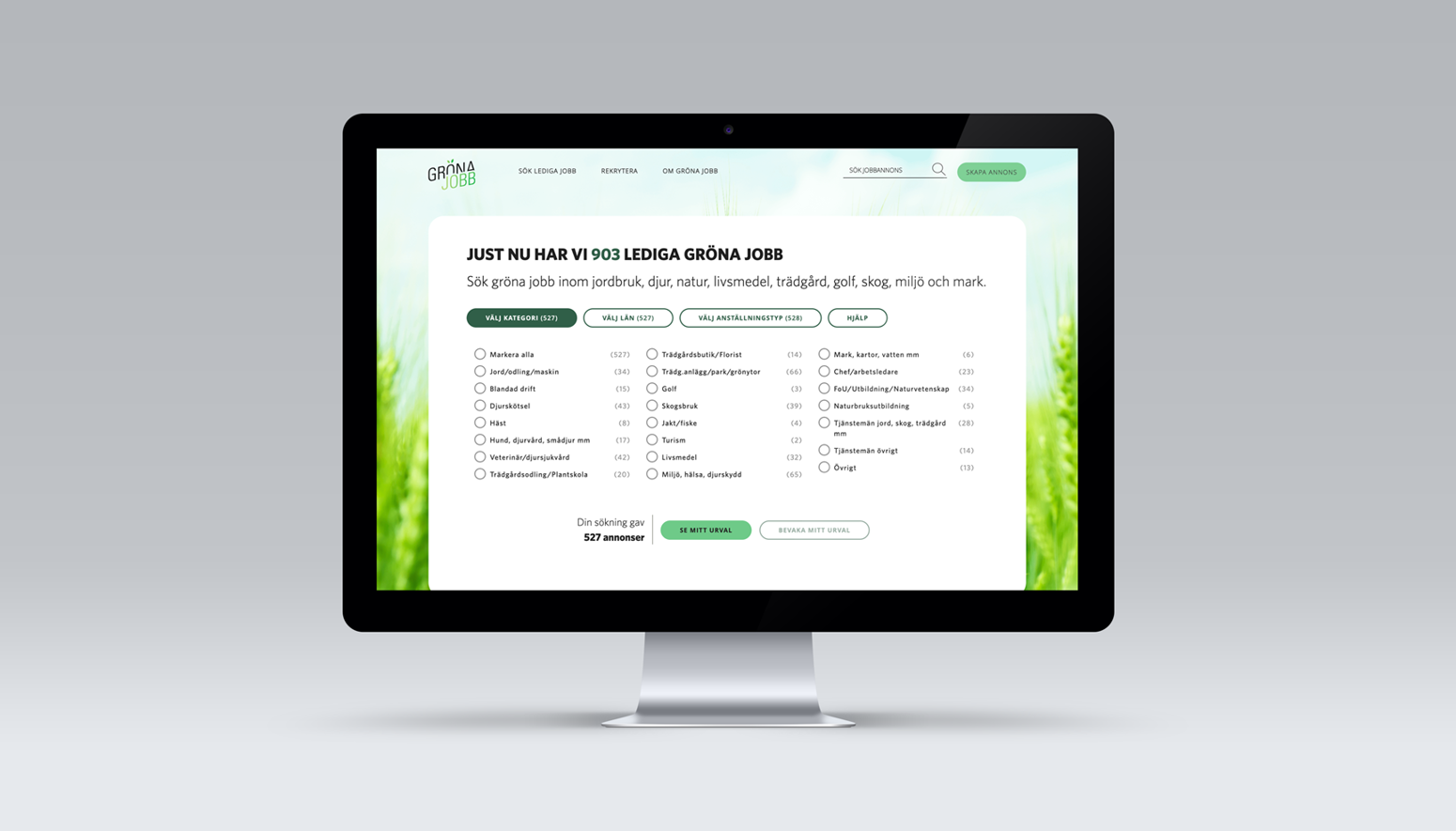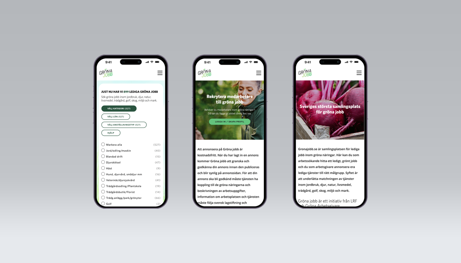 Blinka Blå fick i uppdrag att uppdatera och göra justeringar av färger, bilder, layout och copy på Gröna jobbs webbplats, för att optimera UX samt förbättra deras visuella identitet.